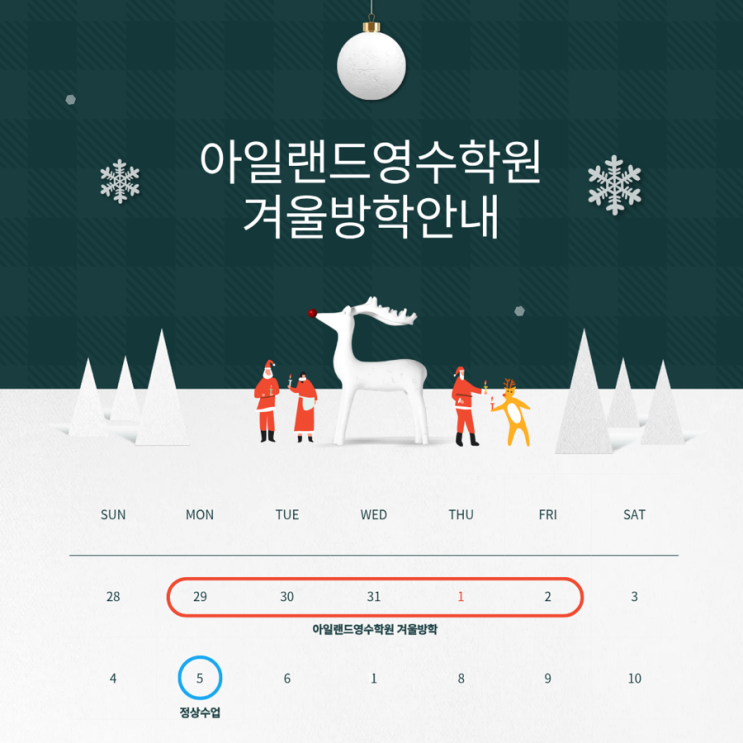 12/29(월)-1/2(금) 아일랜드영수학원 겨울방학이에요! 가족 모두 새해 복 많이 받으시고 바라시는 일 모두 잘 이루어지길 바랍니다 :) <img src="https://blogthumb.pstatic.net/MjAyNTEyMjZfMjgg/MDAxNzY2NzQ2MTQ3MzUy.NPquSYXVS0dczaCIWW7fUOchYGr6YCI09erISFStvMgg.u1FjgKAjqSzbduCyDJBP6gUL7r4PH7_CyggAn2BMLAIg.PNG/IMG%A3%DF2328.PNG?type=s3" />