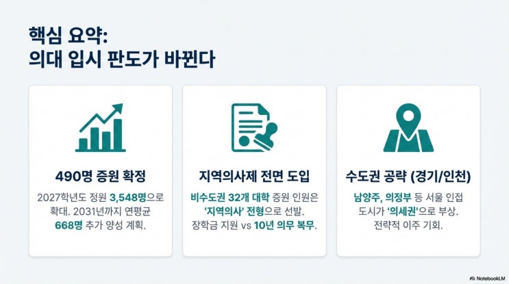 정부 확정 발표 분석: 지역의사제 도입과 대학별 입시 변화 의대 입시의 대전환, 증원 규모와 로드맵 증원 규모: 2027학년도부터 정원이 3,548명으로 대폭 확대되며 입시의 문턱이 낮아질 전망입니다. 새로운 전형: 비수도권 대학을 중심으로 '지역의사제'가 도입되어 장학금 혜택과 지역 근무가 연계된 새로운 합격 루트가 생깁니다. 지리적 전략: 서울 인근의 경기/인천 지역이 '의세권'으로 부상하며 전략적 거주지 선택이 중요해졌습니다. 2031년까지 이어지는 의사 양성 로드맵 지속적 증원: 2027년 1단계 증원(490명)을 시작으로 2030년 이후에는 3,871명까지 선발 인원을 계속 늘려갈 계획입니다. 정원 확대의 가속화....... <img src="https://blogthumb.pstatic.net/MjAyNjAyMTJfMjUz/MDAxNzcwODk3NDE2MzEz.S58nk6-txQYFCISaZduDQS0vcQ6xEif_ecFgdVdCXFUg.EihZl_FGxf2WY0g50nk7g86UBQZ1QGjLbZIyZdL87VUg.JPEG/2027_Medical_School_Growth_Strategy_2.jpg?type=s3" />