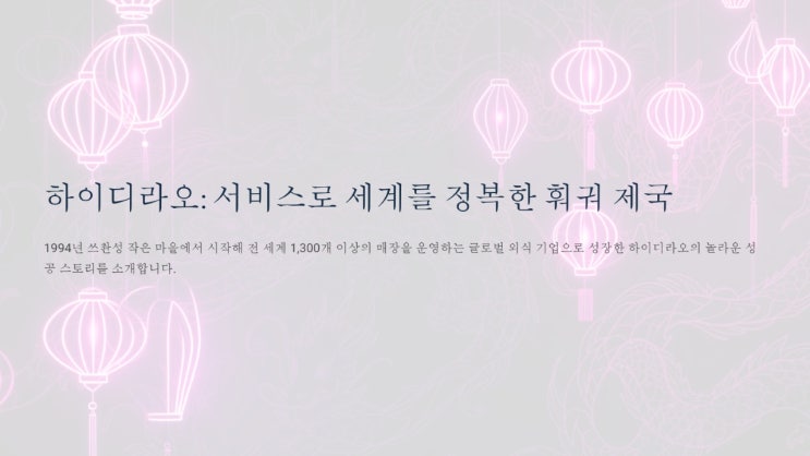 안녕하세요!! 쥔장 인사 드림니다 추위가 가는듯 합니다. 오늘은 중국 내부 뿐 아니라 세계적으로 이름을 날리는 하이디라오 브랜드에 대해서 소개할까 합니다 또 이건 제가 3월 지역 커뮤니티에서 강연할 주재이기도 하구요 뭐 때문에 하이디라오 하는 걸까요? 쥔장이 여기저기 자료를 검색해서 앋은 답은 중국적이지 않은 서비스와 차별하되있는 서비스 현재 중국기업들은 3차산업인 서비스 쪽에대해 투자를 엄청나게 하고 있지요 그 대표적읻고 선구적인 주자가 바로 "하이디라오"입니다 도대체 왜 왜!! 실제로 한국이나 기ㄷ타 해외에서는 그저 샤브의 개념으로 선택의 폭이 많다 보니 많이들 찾고 있지만 중국에서는 정말 획기적....... <img src="https://blogthumb.pstatic.net/MjAyNjAyMjVfMTAz/MDAxNzcyMDAwMzMwMTg4.GVzB5-lOx6q8p9K3933arptyO0w-p3OQf59eNGc8cS4g.ZQU0nxzO1BEeY7yTNSkSMKglz1PNB_NuaJi8BNLDKPgg.JPEG/1.jpg?type=s3" />