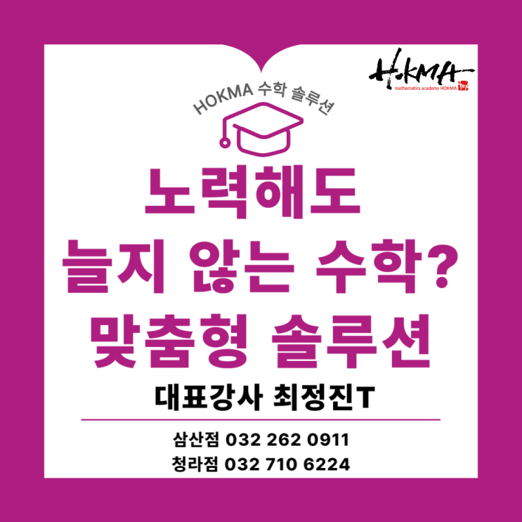 안녕하세요. 산곡동 수학학원, 호크마수학학원입니다. 열심히 하려는 의지는 분명한데, 성적은 좀처럼 올라가지 않으면 마음은 더 조급해질 수밖에 없습니다. 시간도 충분히 쓰고, 문제도 많이 풀고 있는데 결과가 따라오지 않는다면? 그 원인은 노력 부족이 아니라 공부 방향 문제일 가능성이 큽니다. 그래서 오늘은 왜 실력이 제자리걸음이 되는지 원인과, 그리고 그 문제를 해결해 나가는 방법에 대해 산곡동 수학학원 호크마 대표강사 최정진 선생님의 맞춤형 학습 솔루션에 대해 살펴보려고 합니다. Insight 많은 학생들이 충분히 노력하고 있음에도 수학에서 눈에 띄는 변화가 나타나지 않는 경우가 많습니다. 그 이유는 의외로 단순합니다....... <img src="https://blogthumb.pstatic.net/MjAyNjAyMjRfMzIg/MDAxNzcxODcyNjk1NzEw.8dygFG2XoEWSvROtWhS5TGOu5YvRrOQwUn3TwdjeLvQg.Y14mardGvJVrP5pcNCBf1S1-UEvdepNuRSFyoDb2e-cg.PNG/001.png?type=s3" />