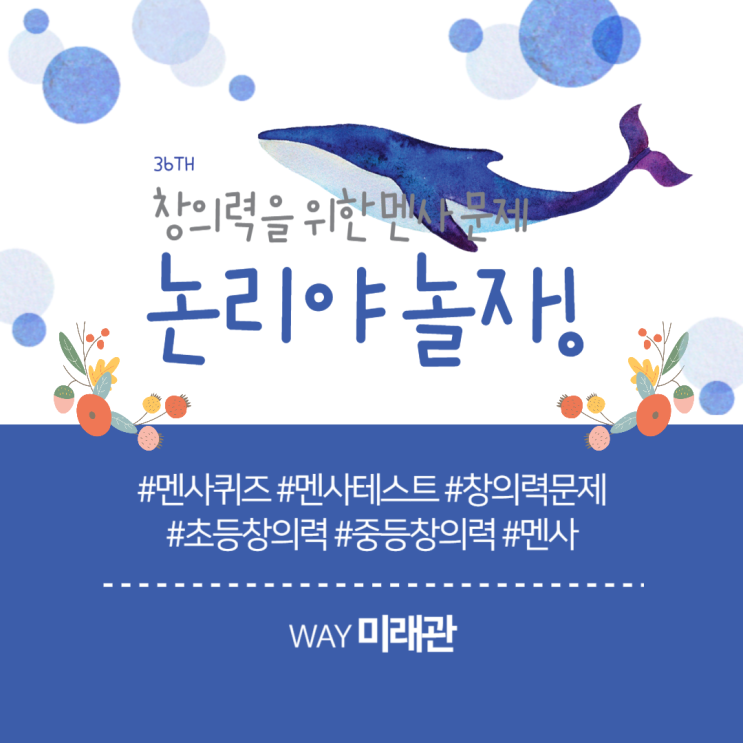안녕하세요. WAY 학원입니다. 오늘은 초중등 학생을 위한 멘사 문제를 준비해 보았습니다. 다들 준비됐나요~?! 그럼 시작해 볼까요? 첫 번째 문제 물음표에 들어갈 숫자는 무엇일까요? 첫 번째 문제 풀이 첫 번째 그림에서 밑에 깔린 삼각형의 수는 왼쪽에서 오른쪽 순으로 942 위에 있는 삼각형의 수는 왼쪽에서 오른쪽 순으로 861 순서로 세 자리 숫자를 만들어 서로 뺀 값이 가운데 수입니다. 즉, 따라서 정답은 189입니다. 두 번째 문제 각 도형이 나타내는 숫자를 유추하여 물음표에 들어갈 자연수를 찾아보세요. 두 번째 문제 풀이 세 번째 문제 A~D 중 빈 부분에 들어갈 알맞은 패턴은 무엇일까요? 세 번째 문제 풀이 그림판은 첫째 가로....... <img src="https://blogthumb.pstatic.net/MjAyNjAyMjFfMjY3/MDAxNzcxNjU5MDQ4MTAx.375p8sE9uuKGlaK3r06JJVRgS1mB0v6PBWI4Ijy-MbQg.xQ_qBSDrsD55mgEfAPdiA5ndzw-cxe2gyeh1GzE9owsg.PNG/%B8%E0%BB%E736.png?type=s3" />