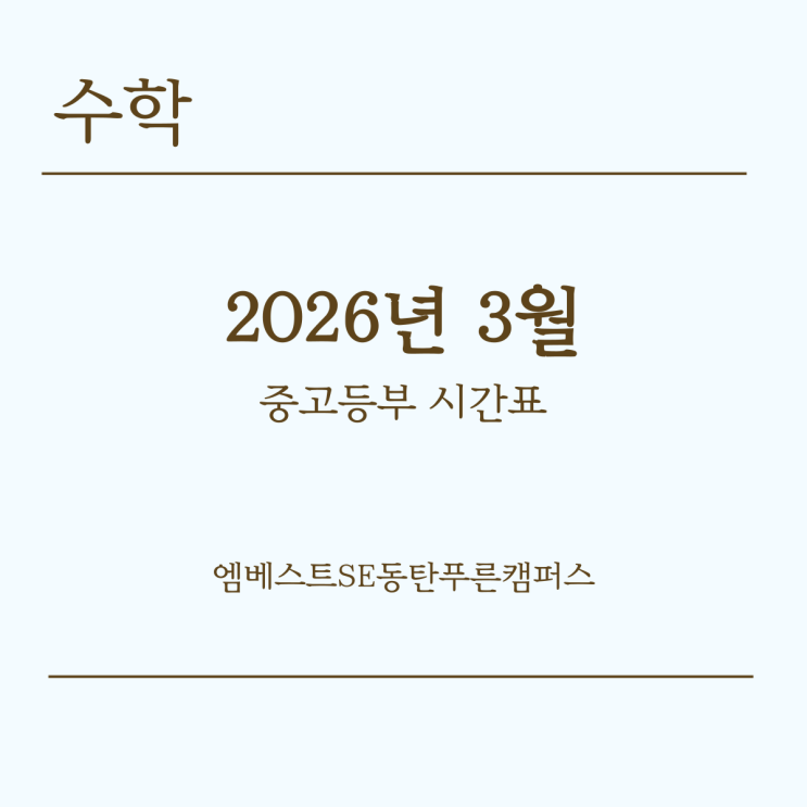 안녕하세요. 엠베스트 SE동탄푸른캠퍼스 Lisa 원장입니다. 3월 새학기 중·고등부 수학반 시간표 안내드립니다. ※ 내신 대비 + 모의고사(중등: 수행평가) 병행 관리 ※ 정원 마감 시 추가 모집 없습니다. [문의 및 신청 방법] 전화 문의 | 031-613-0536 카카오톡 상담 온라인 상담 신청 <img src="https://blogthumb.pstatic.net/MjAyNjAyMjRfODkg/MDAxNzcxOTEyOTEwNTA3.ocDgPUVQ8Iw0xubf-A1rRZVikxFbH_vqg626rtA4Tm0g.-Mde-b0321EoJkwHNFx_zOjjsNT_fuKbWZTqhUUhpuYg.PNG/006.png?type=s3" />