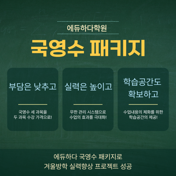 안녕하세요! 신원동 학습 동반자 에듀하다학원입니다! 겨울 날씨가 참 변덕스럽기 그지없네요. 건강 유의하셔야 할 변덕스런 날씨입니다. 오늘은 에듀하다학원 윈터스쿨에서 준비한 국영수 패키지 프로모션에 대해 포스팅 해볼게요~~ 먼저 대상은 예비고 1, 2이구요. 국영수 세 과목을 599,000원에 수강가능한 파격적인 프로모션을 진행합니다!!! 두 과목 수강 금액으로 국영수 세 과목을 수강할 수 있는 절호의 기회! 국영수 패키지 프로모션을 통해 에듀하다의 수업 퀄러티와 무한 관리 시스템을 경험하시고 학생들의 실력 향상을 확인하세요!! 이것만 있냐구요? 에듀하다학원은 기왕 하는 프로모션 화끈하게 진행한답니다~ 국영수 패키지 수강....... <img src="https://blogthumb.pstatic.net/MjAyNTEyMjlfNDcg/MDAxNzY2OTg2MTI0MDQ1.MlbHXMGsHFC1OyBugcqyC1FAaghIoMGCtI55FhsSzEQg.HE9yIrYXIht7PgnQagv2TxI7VQ6bkzCdhPyh0WhDFrwg.PNG/%C6%D0%C5%B0%C1%F6.png?type=s3" />