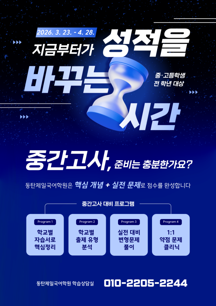 안녕하십니까? 동탄제일국어학원입니다. 2026년 1학기 중간고사가 다가오고 있습니다. 우리 아이들이 좋은 점수로 중간고사를 치르도록 노력하겠습니다. 지금 이 시기가 국어 공부를 시작할 가장 빠른 시기입니다. 망설이면 망설인 만큼 국어 성적은 뒤쳐지게 됩니다. 공부할 내용이 많은 과목이 국어이므로 국어 공부에 자신감을 갖도록 도와줘야겠습니다. <img src="https://blogthumb.pstatic.net/MjAyNjAzMThfMTIw/MDAxNzczODI0MTU5NjI3.iSndNaBgSXsbrnZwZZAQuAEZzBBistpiIvLHoCbnElgg.jwznpme60T4Vs0qxBMFxbDMa9xLKBAHl_YBzBRYkYKEg.PNG/001.png?type=s3" />