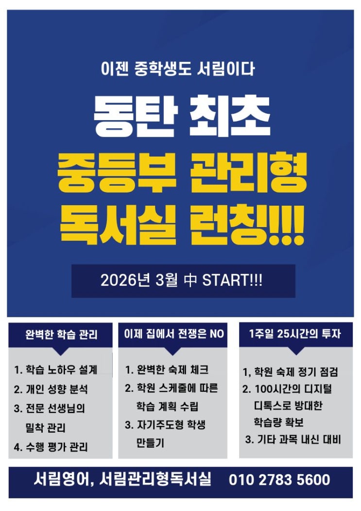 이제 중학생도 서림이다. 동탄 최초 중학생 관리형 독서실 런칭!!!
