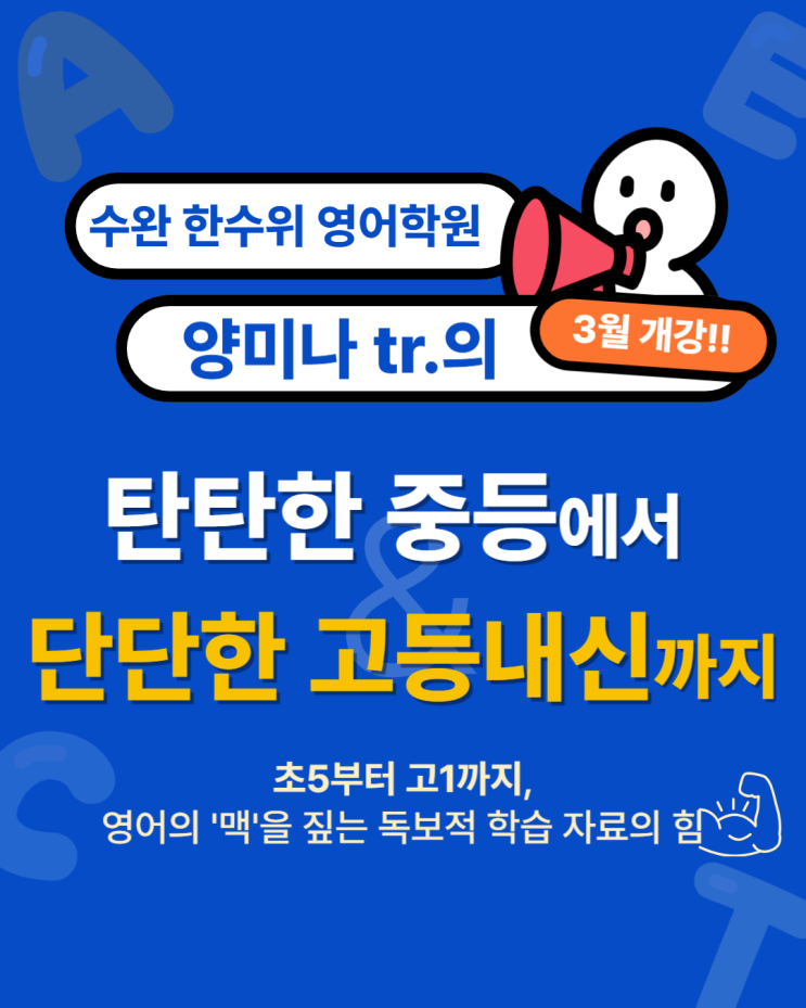 수완지구 영어학원 한수위 영어 학원 탄탄한 중등에서 단단한 고등내신까지 초등 5학년부터 고등 1학년까지 영어의 '맥'을 짚는 독보적 학습 자료의 힘 양미나tr. Step 1 (초등) : 중학 영문법의 뼈대를 잡는 원리 중심 자료제공. Step 2 (중등) : 서술형 대비부터 외부 지문까지 완벽 분석한 ‘고퀄리티 내신 대비자료'. Step 3 (고1) : "단어를 나열하는 영작은 끝났습니다. 문법적 원리로 설계하는 '논리적 서술형’!” 수완 한수위 영어전문학원 양미나tr 3월 개강 시간표 고1 "중학교식 '통암기'는 통하지 않습니다. 고1 내신의 승부처, 서술형 감점 0점에 도전하라!" 자체 제작 수업 자료 : ....... <img src="https://blogthumb.pstatic.net/MjAyNjAyMjVfMjI3/MDAxNzcxOTgzMDU0MTIw.UKjU13mGMwtOtDSX5t6-TxZUMR_a4tTovubelBQBQv8g.KFGnmdVcKabocrhMNrgVMdu7sFcnGNeV091xDendPIog.PNG/002.png?type=s3" />