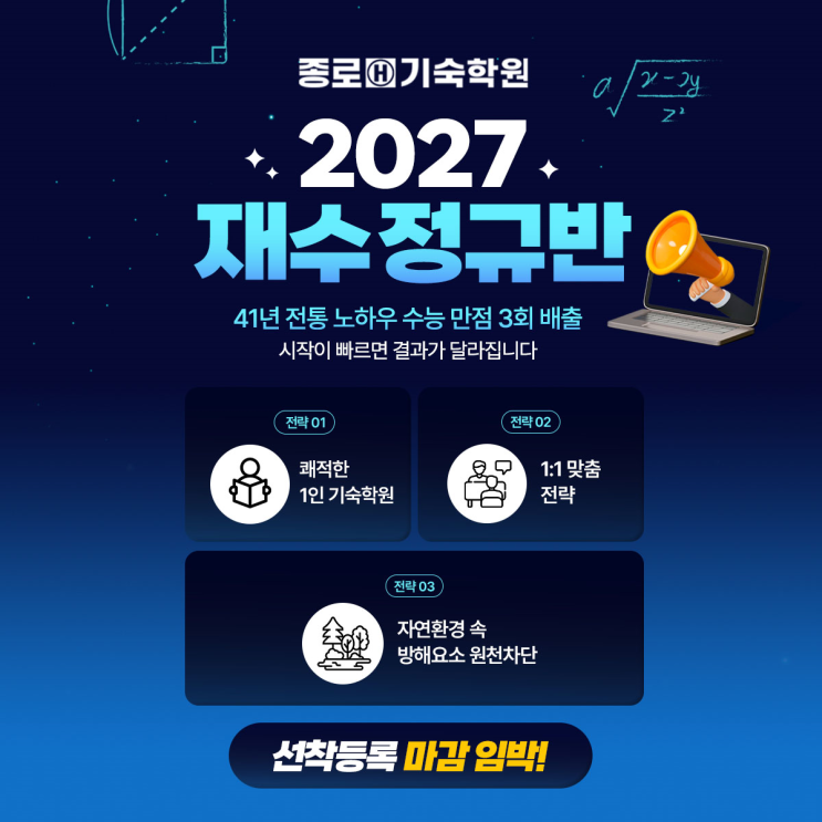 부산 독학 재수 기숙학원 키워드로 검색하다 보면 결국 많은 분들이 “관리형 기숙 시스템”으로 방향을 잡습니다. 혼자 공부는 가능하지만 ✔ 루틴이 자주 깨지고 ✔ 오답 관리가 밀리고 ✔ 멘탈이 흔들릴 때 붙잡아 줄 구조가 필요하다면 단순 자습 공간이 아니라 관리 + 환경 + 생활 통제가 함께 가는 시스템이 필요하기 때문입니다. 오늘 포스팅은 종로H기숙학원 2027 재수정규반 모집 소식과 함께 학원 시설과 운영 구조를 중심으로 정리해드립니다. 상담문의 : 052-263-3859 재수는 “의지 싸움”이 아니라 “루틴 싸움”입니다. 정규반은 단순 수업 개강이 아니라 ✔ 연간 학습 로드맵 (개념 → 기출 → 실전) ✔ 하루 생활 루틴 고정 ✔....... <img src="https://blogthumb.pstatic.net/MjAyNjAyMjZfMjEw/MDAxNzcyMDgxNTkyMzQy.AL9lkrTUs2uLbtuck7Ra2yiINgOtJTHWC-9-RfzPXsQg.sqN449I9vxNMKpuQmVKLgFgw-Y57u0hlT_De4HQRUn4g.PNG/image.png?type=s3" />
