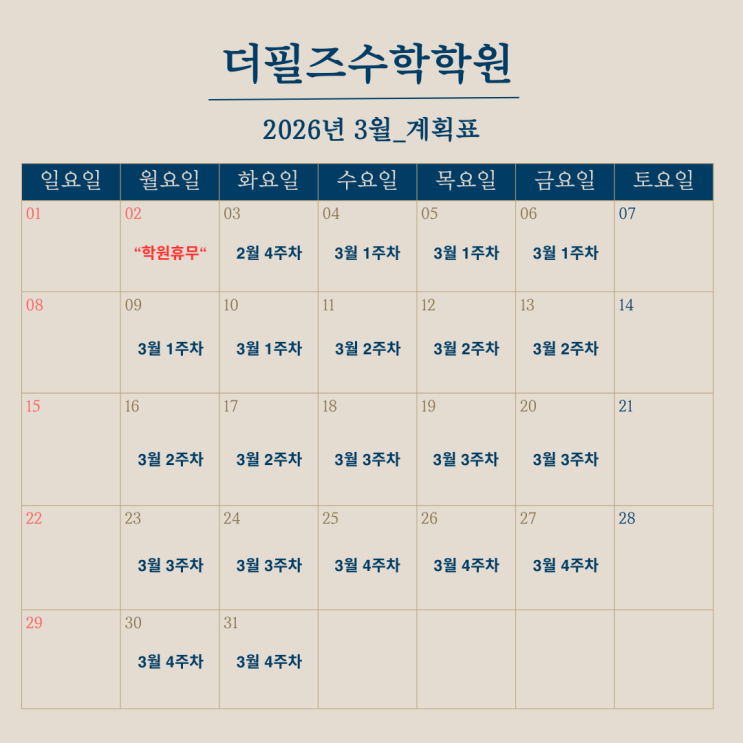 문의전화 : 010-5023-7923 ⭐️더필즈 수학학원 26년3월 학사일정안내 ⭐️ 안녕하세요. 더필즈수학학원입니다. ⭐️매월 마지막주는 다음달(3월) 학습등록기간입니다.⭐️ -카드결제링크 원하시는 분은 말씀해주세요~ -입금 진행을 원하시면, 이체 후 꼭 알려주세요~ (아이 이름으로 입금부탁드릴게요.) (1002-832-490275 우리은행 허승연) ⭐️ 3월 휴뮤일 있음⭐️ 3월2일 학원 휴원입니다. ♥ 저희 더필즈수학학원은 한 달 4주 (12회)에 맞추어 수업을 진행합니다.♥ 수업일정을 꼭! 확인해주시고, 여행이나 추가 다른 일정이 있을 때에는 수업일 최소 4일전 미리 말씀해주시면 보강수업 가능합니다. (당일 통보결석=보강불....... <img src="https://blogthumb.pstatic.net/MjAyNjAyMjRfMjE0/MDAxNzcxOTIxNTAyMTQ4.uhVok7U3RriwebcHNvzBrdcIEZ-SWsZ54ZDatssQxq4g.yfeKjg6jOWVNSZZibOGm3MuUrVAYib-F8uFMXWCE9XIg.PNG/3%BF%F9%BD%C3%B0%A3%C7%A5.png?type=s3" />