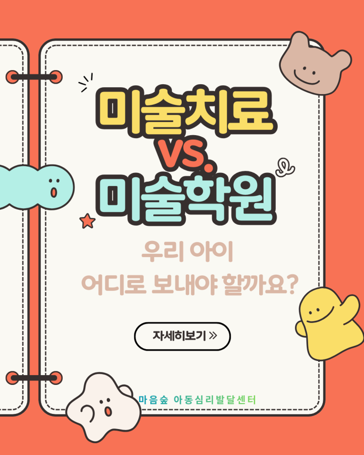 안녕하세요, 365다움의원파주운정 병원부설 마음숲 아동심리발달센터입니다. 아이의 발달이나 정서 케어를 고민하며 센터를 방문하시는 부모님들께서 가장 많이 하시는 질문 중 하나가 바로 이것입니다. "미술치료랑 미술학원이랑 뭐가 다른가요? 결국 그림 그리는 건 똑같지 않나요?" 언뜻 보기엔 둘 다 붓을 잡고 도화지 앞에 앉아 있지만, 그 목적과 과정은 완전히 다릅니다. 오늘은 우리 아이에게 왜 '미술 학습'이 아닌 '미술 치료'가 필요한지 그 차이점을 명확히 짚어드릴게요. 1. '결과물'이 아닌 '아이의 마음'을 봅니다 미술학원: 멋진 풍경화, 형태가 정확한 사물을 그려내는 ....... <img src="https://blogthumb.pstatic.net/MjAyNjAyMjVfMTQx/MDAxNzcxOTg0NTIzODI5.3IO4QyDrVx8xbHntNTWsMlHWWN7fxYLjMjf5HNtT2LAg.UhM6zPfCgdOpU3vPk6y0LCAlQHrdJv1bR3N0JXeyvBAg.PNG/1.png?type=s3" />