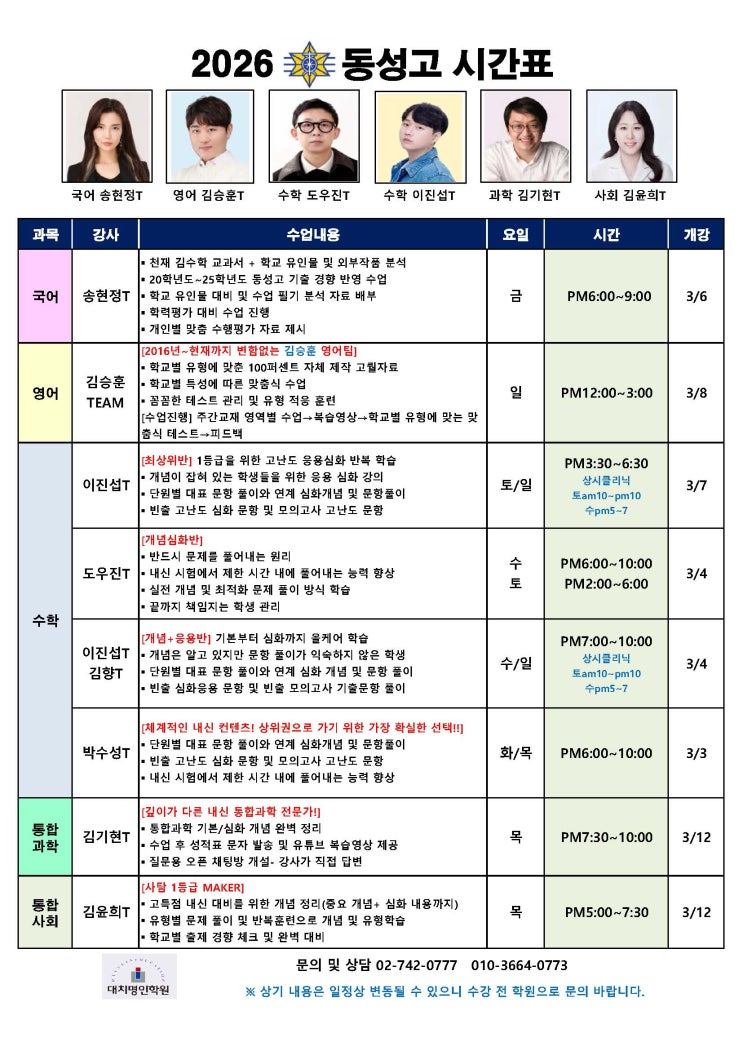 [대치이상학원] 26년 1학기 시간표 안내