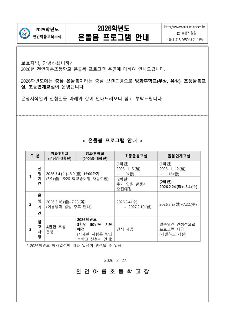 새 학년이 다가오면 가장 먼저 챙겨야 하는 것 중 하나가 방과후·돌봄 신청입니다. 천안아름초에서 안내한 2026학년도 온돌봄 프로그램(충남 온돌봄) 내용을 바탕으로, 신청 기간/운영 기간/포인트를 한 번에 정리해드릴게요. (학사 일정에 따라 변경될 수 있어요) 1) 2026학년도 천안아름초 온돌봄 운영 항목 2026학년도에는 “충남 온돌봄” 브랜드로 아래 프로그램이 운영됩니다. 방과후학교(무상: 1~2학년) 방과후학교(유상: 3~6학년) 초등돌봄교실 돌봄연계교실 문의(학교): 늘봄지원실 041-418-9650(내선 1번) / 학교 홈페이지: areum.caees.kr 2) 신청 기간 한눈에 보기 방과후학교(무상 1~2 / 유상 3~6) 신청: 2026.3.4(수) ~ 3.9(월) 15....... <img src="https://blogthumb.pstatic.net/MjAyNjAyMjdfMjcg/MDAxNzcyMTc0MzM5Nzc4.O2PkSbniLA6DfW5yzW4nxt_XUXICv-N6cego-NHIB9Ug.Wq0fSBkfCCnNfrFhKp28zcuqtJZD79TroyK-RnGHg6Qg.JPEG/KakaoTalk_20260227_151925221.jpg?type=s3" />