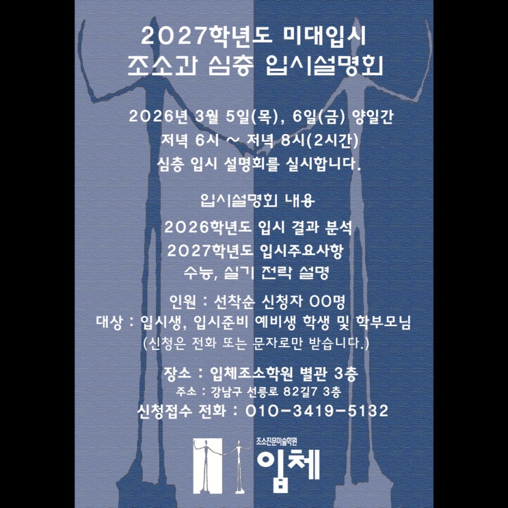 3월5일(목), 3월6일(금) 양일간 오후 6시~8시(2시간) 조소과 입시 심층 입시설명회를 실시합니다. 조소과를 준비하는 학생 및 학부님의 많은 참여 바랍니다. <img src="https://blogthumb.pstatic.net/MjAyNjAyMjNfOTIg/MDAxNzcxODQ0Mjc1Njc4.UAa1W-FNRFin621wjGcdRetMVwplJIvWPOQNpQwb2YQg.ms5n1iwOik4Kf32a4J8UAEviW5XepvbLAZeyshS-YFEg.JPEG/Whitagram-Image.jpeg?type=s3" />