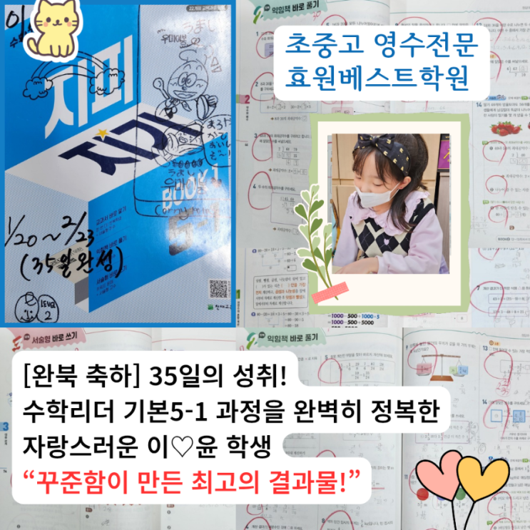 ▪️예비초5 이♡윤 학생 수학리더 기본5-1 교재 35일 만에 완북! 초중고 영어·수학 전문 효원베스트학원의 예비초5 이♡윤 학생이 <수학리더 기본5-1> 교재를 35일이라는 짧은 기간 안에 완북하며 뛰어난 학습 성과를 보였습니다. <수학리더 기본>은 초등 수학 개념을 탄탄히 다지기 위한 필수 교재로, 교과서 핵심 개념을 익히고 다양한 문제 유형(기초력 문제, 익힘책 문제, 서술형 문제 등)을 연습할 수 있도록 구성되어 있습니다. 단순한 계산력 향상뿐만 아니라 창의적 사고력과 문제 해결 능력을 키우는 데 초점을 맞춘 점이 특징입니다. 이♡윤 학생은 꾸준함이라는 가장 큰 무기로 매일 주어진 학습량을 채워 나가며 개념 이....... <img src="https://blogthumb.pstatic.net/MjAyNjAyMjVfMjUz/MDAxNzcyMDI3MzUyMzQ5.BSFdm2VBMevRKTnbuXYwCHPacyNCRyMB0Ve14kwjSa4g.w_JCkfSmO_9LwXVbtnKTO5yNHQM8xm288C3NqujtKtEg.PNG/900%A3%DF%3F%A3%DB%BF%CF%BA%CF_%C3%E0%C7%CF%A3%DD_35%C0%CF%C0%C7_%BC%BA%C3%EB%A3%A1_%BC%F6%C7%D0%B8%AE%B4%F5_%B1%E2%BA%BB_%B0%FA%C1%A4%C0%BB_%BF%CF%BA%AE%C8%F7_%C1%A4%BA%B9%C7%D1_%C0%DA%B6%FB%BD%BA%B7%AF%BF%EE_%C0%CC%A2%BD%C0%B1_%C7%D0%BB%FD_%26ldquo%3B%B2%D9%C1%D8%C7%D4%C0%CC_%B8%B8%B5%E7_%C3%D6%B0%ED%C0%C7_%B0%E1%B0%FA%B9%B0%A3%A1%26rdquo%3B%A3%DF20.png?type=s3" />
