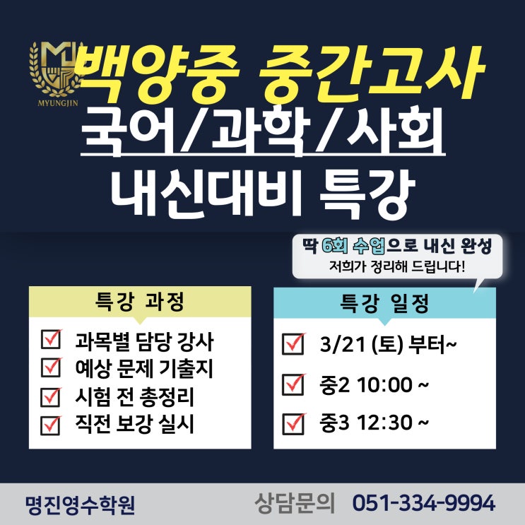 안녕하세요. 명진영수학원 입니다. 영어, 수학만 학원 다니면 성적이 괜찮을까요? 전과목에 대한 기본적인 성적을 놓치면, 나중에 만회하기 정말 어렵습니다 ㅠㅠ 내신 특강 매일 듣는 수업은 아이가 부담스럽다 하나요? 그럼 딱 6회 수업으로 끝나는 만덕 백양중 한정 국어, 사회, 과학 수업은 어떠세요? ▼▼중/고등부 특강 전체 일정 ▼▼다양한 정보를 듣고 싶다면? 간단 문의 051-334-9994 <img src="https://blogthumb.pstatic.net/MjAyNjAzMTlfMjU1/MDAxNzczOTA4MDE2Mzc3.COE4visFqtpV_f3LpoCkqhDearxhv_RWcd0x9Teny1Qg.FTjXfiCAROXv-sp6t4q806dhPRJe24n49OpZdm0AMRsg.JPEG/%C1%A6%B8%F1%C0%BB-%C0%D4%B7%C2%C7%D8%C1%D6%BC%BC%BF%E4_-001_%284%29.jpg?type=s3" />