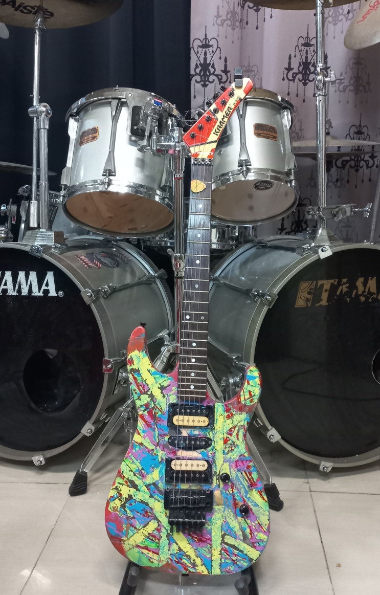 또 다시 기타제작! 바디가 거의 벗겨진 1980년대 일본산 Kramer 의 LK4 를 구입. 아마도 나같은 작업을 하려던 자가 중도에 포기하고 판매한듯. 넥은 잭슨이나 샤벨인거 같다. 잘 보관했다가 다음 뻘짓을 할때 사용예정. 픽업들 포함 부품들은 모두 순정부품인듯. 난 크레이머의 이 KP 100 픽업을 아주 좋아한다. 푸쉬풀 기능도 있다. 이번에 내가 표현하려는건 Eddie Van Halen 의 프랑켄을 Splatting 으로 표현하는 거다. 스플래팅이 뭐냐하면 이런거다. 물감을 붓에 묻혀서 확 뿌리는거다. 예전에 작업했던 작품. 이번작업에 사용한 물감들과 우레탄 스프레이들. 다 합쳐도 만원이 안 된다. 1차적으로 노랑바탕을 붓으로 죄다 칠했다. 테잎들....... <img src="https://blogthumb.pstatic.net/MjAyNjAzMTdfNjAg/MDAxNzczNzA1NTU4Mzc1.dBar1U4tOeltGp4zUHbXXgl0g7pom2N2i_55Ey8y_KQg.5gwnqBV3KPB6E-NlsCJ5g7wzlm-OluUdJIpMx9viaeMg.JPEG/KramerLK4.jpg?type=s3" />