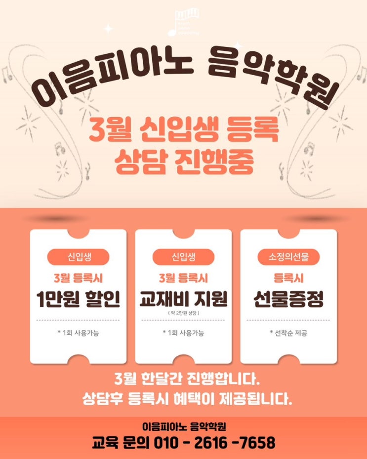 안녕하세요. 이음피아노 음악학원입니다 새로운 시작의 계절 3월을 맞아 신입생 상담을 진행하고 있습니다. 피아노는 단순히 악기를 배우는 것을 넘어 음악을 즐기고 스스로 표현하는 힘을 키워가는 과정이라고 생각합니다. 이음피아노 음악학원에서는 개인의 성향과 속도에 맞춰 음악을 즐기며 배울 수 있도록 지도하고 있습니다. 새학기를 맞아 새로운 시작을 응원하는 마음으로 3월 이벤트를 준비했습니다. ✔ 3월 등록 시 1만원 할인 ✔ 교재비 지원 (약 2만원 상당) ✔ 소정의 선물 증정 (선착순) 이번 이벤트는 3월 한 달간 진행되며 상담 후 등록 시 혜택이 제공됩니다. ....... <img src="https://blogthumb.pstatic.net/MjAyNjAyMjZfMTc5/MDAxNzcyMDc3NzYzOTIz.UiVBh7dTWMAGEidD9FdDFy7-eu-vbpmaFJvj2mrIOV8g.vWPTZEOpP_i9Fi07NDd879aREjQ0cNjkMCgD16_JMo0g.JPEG/IMG%A3%DF0266.JPG?type=s3" />
