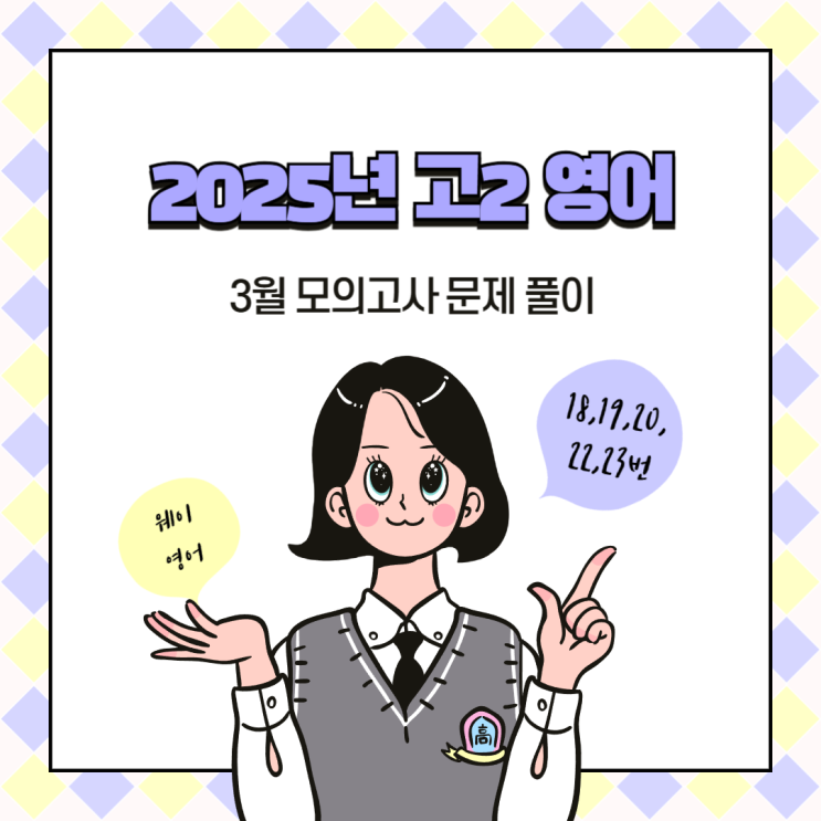 안녕하세요. WAY 학원입니다. 오늘은 2025년 고2 영어 3월 모의고사 문제 풀이를 포스팅해 보겠습니다. 18번 글의 목적 18번은 글의 목적을 파악하는 문제입니다. 웨이티의 풀이로 정답을 확인해 보세요! 19번 심경변화 19번은 인물의 심경 변화를 파악하는 문제입니다. 웨이티의 풀이로 정답을 확인해 보세요! 20번 주장 파악 20번은 필자의 주장을 파악하는 문제입니다. 웨이티의 풀이로 정답을 확인해 보세요! 21번 함축 표현 21번은 밑줄 친 문장의 함축적 의미를 파악하는 문제입니다. 웨이티의 풀이로 정답을 확인해 보세요! 22번 글의 요지 파악 22번은 글의 요지를 파악하는 문제입니다. 웨이티의 풀이로 정답을 확인해 보세요! 23번 주....... <img src="https://blogthumb.pstatic.net/MjAyNjAyMjNfMjMx/MDAxNzcxODQxMDQ0MjQz.Ru6K0HyTDStDpD4-UPbImqU_bqRhKdhivqFkUY7puV8g.aLMkiphk1EZcUbbfZfD6fSyUt6EE_bJP0mSgLjfidL4g.PNG/%C1%A6%B8%F1%C0%BB_%C0%D4%B7%C2%C7%D8%C1%D6%BC%BC%BF%E4_-001_%283%29.png?type=s3" />