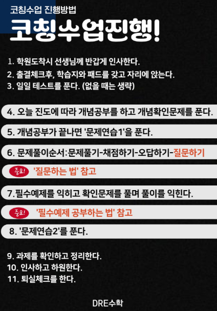 안녕하세요,1:1 코칭 전문 DRE수학 원장입니다. 3월은 한 학기의 방향이 결정되는 중요한 시기입니다. 지금 기초를 정확히 잡지 않으면 중간고사 직전에 흔들리게 됩니다. 3월은 ‘진도’가 아니라 ‘완성도’를 만드는 시간입니다. 3월 수업 운영 구조 ✔ 1~4주차 : 개념 완성 + 필수 문제 정복 교과서 핵심 개념 정리 필수 유형 반복 훈련 계산 실수 교정 서술형 대비 풀이 훈련 목표 : 시험 범위 기본 80% 완성 ✔ 5~6주차 : 학교 교재 + 실전 훈련 교과서 심화 문제 학교 프린트 분석 기출 유사 문제 풀이 실전 시간 재기 훈련 목표 : 실수 줄이고 90점 이상 안정화 ✔ 시험 1주 전 : 모의 실전 6회 이상 진행 실제 시험처럼....... <img src="https://blogthumb.pstatic.net/MjAyNjAyMjRfMzQg/MDAxNzcxOTQxNDExMzI1.VTiq2Y7FCCAVtlrAT2TShWYPMGCBy5FJ2CymePk_-Lwg.k3RdWIpRSSntCsI6kjuVXdVw8LlHjjDZOnTFzGjyCxgg.PNG/20260224_225332.png?type=s3" />