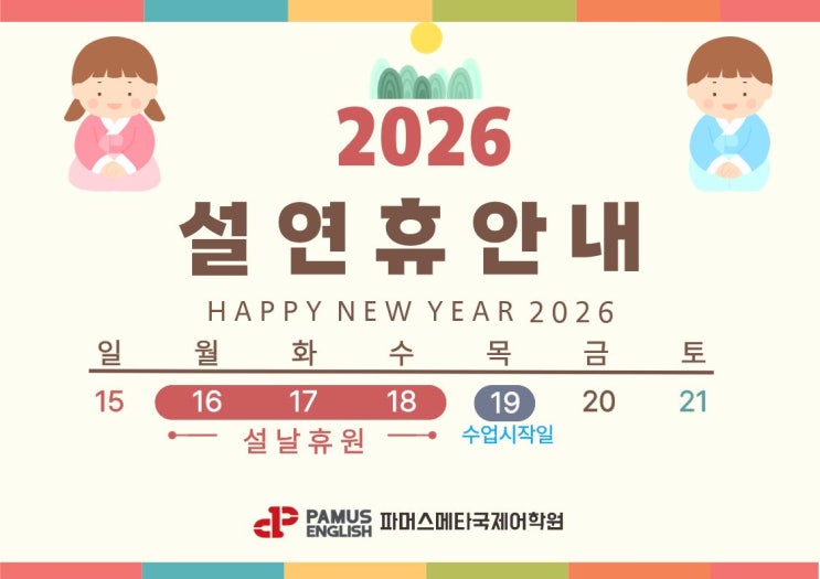 안녕하세요. 파머스메타국제어학원입니다. 한 해의 시작을 알리는 명절, 구정 설날이 다가오고 있습니다. 학원에서 매일 아이들을 만나며 느끼는 것은,아이들의 성장은 교실 안에서만 이루어지는 것이 아니라는 점입니다. 가족과 함께 웃고, 대화하고, 사랑을 느끼는 시간.그 시간이 아이들의 마음을 단단하게 만들고, 그 마음이 다시 학습의 힘이 됩니다. 2026년 구정 설 연휴 일정 안내 ■ 휴원 기간 1월 16일(월) ~ 1월 18일(수) ■ 수업 시작 1월 19일(목) 정상 수업 진행 연휴 이후 모든 수업은 기존 시간표대로 운영됩니다. 설날은 아이에게 ‘마음의 에너지’를 채우는 시간입니다 아이들을 지도하다 보면,성적이나 실력보다 더 중요한 것....... <img src="https://blogthumb.pstatic.net/MjAyNjAyMTRfMTI0/MDAxNzcxMDYwODg5NTI0.9uLgKPsHuVjeJmUr6WCUpvMD3b6TV8xWXrCrcvpKxoog.EgnESz4v8umbhBuSyQCPI1DyiOr2Zcki-s63pKsOs94g.JPEG/%C1%A6%B8%F1%C0%BB_%C0%D4%B7%C2%C7%D8%C1%D6%BC%BC%BF%E4..jpg?type=s3" />