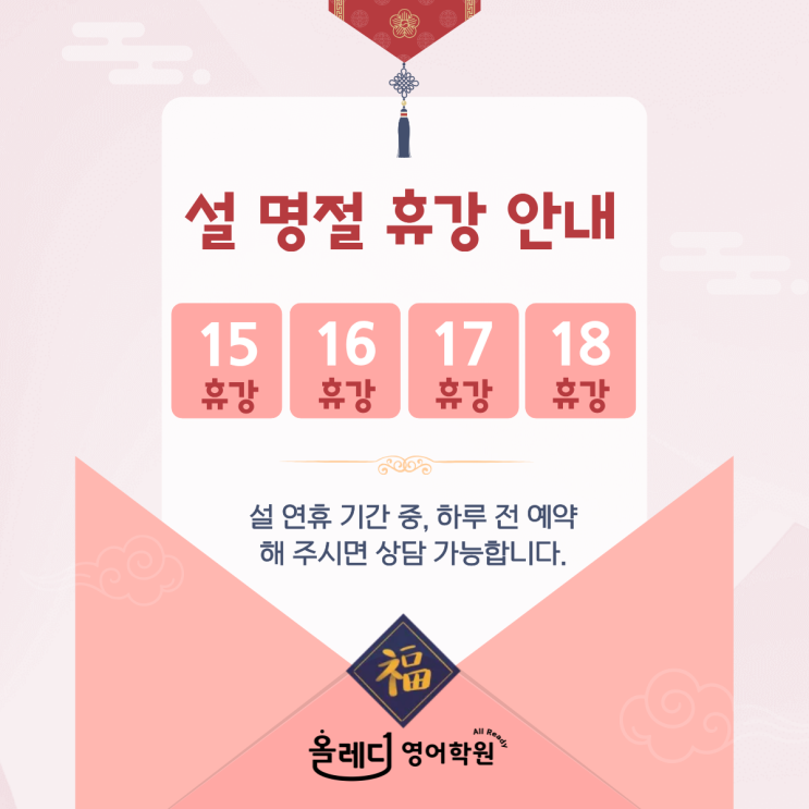 안녕하세요, 금곡동 올레디영어학원입니다. 설 연휴 기간에도 올레디 영어학원은 사전 예약 상담을 진행합니다. 연휴 중 상담을 원하시는 경우, 하루 전까지 편하게 예약 문의 주세요. <img src="https://blogthumb.pstatic.net/MjAyNjAyMTBfMjM3/MDAxNzcwNzE5OTQ4MzQ5.X35_El5Td29sr50RGVhlT6VpUTVACauFi8ddOofKu04g.cXjSMj-VdKRzUOKznbSMT6AT6rV7Kfj4LBVGEg6btnog.PNG/%C1%A6%B8%F1%C0%BB_%C0%D4%B7%C2%C7%D8%C1%D6%BC%BC%BF%E4..png?type=s3" />