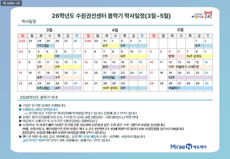 2026학년도 수원권선센터 봄학기 학사일정(3월~5월)