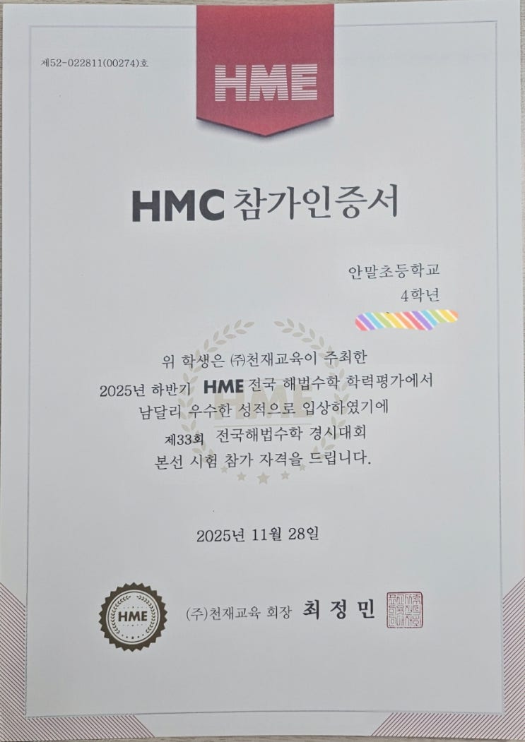 중위권에서 시작해 HME 본선 진출까지 2025하반기 HME 수학경시대회에서 저희 초등부 학생이 본선에 진출하고 HMC 경시대회에 출전하게 되었습니다. HME경시대회 참가학생중 상위 5%만 수상대상입니다. 하지만 이 학생은 처음부터 상위권이 아니었습니다. #개념이 정리가 안 되어 있었고 #응용문제만 나오면 멈췄고 # “저는 수학 잘 못해요”라고 말하던 아이였습니다. 우리는 선행을 멈추고 기초 개념을 다시 설계했습니다. 공식을 외우는 대신 “왜 그런지 설명하게” 했고, 문제를 많이 푸는 대신 “한 문제를 깊게 이해하게” 했습니다. 3개월 후, 풀이가 달라졌고 6개월 후, 사고 과정이 달라졌고 1년 후, 결과가 달라졌습니다. 초등 수학....... <img src="https://blogthumb.pstatic.net/MjAyNjAyMjZfNjUg/MDAxNzcyMTA4MDI5ODg1.oA8C69VMJvDygDWlOMP4LV0yGR6wd33hQiDJHF-MACwg.-h20a-ao4ZsmhDnS_k8dH1IALu4A7OJ6SBVVZEgXHdIg.JPEG/900%A3%DF20251224%A3%DF142638.jpg?type=s3" />