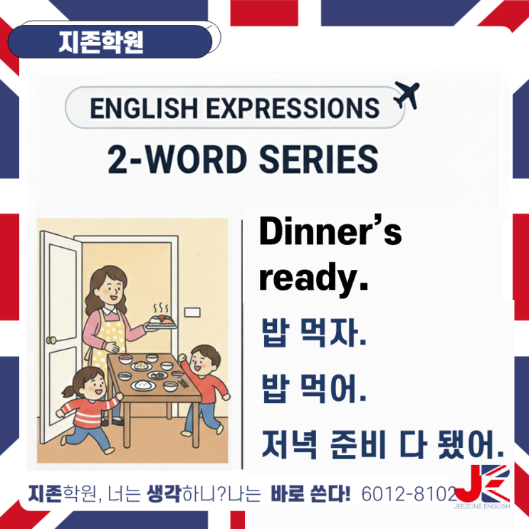 광명 철산동 초등(중등) 영어학원, 광명북초 영어학원, 광명동초 영어학원, 광명 도덕초 영어학원 광명북중 영어학원, 광명중 영어학원, 철산중 영어학원, 개웅중 영어학원, 지존 학원입니다. 1. Dinner's ready 이럴 때 써요 Dinner’s ready = 저녁 준비됐어 = 밥 먹어 아이가 꼭 알아야 하는 이유 - 생활 영어 노출 증가 - 영어 = 공부 → 영어 = 생활 전환 - 자연스러운 듣기 + 말하기 동시 학습 Dinner’s ready! 밥 먹어! Dinner’s ready. Come and eat. 저녁 준비됐어. 와서 먹어. Dinner’s ready. Wash your hands. 밥 준비됐어. 손 씻어. 엄마표 영어 핵심 생활 반복 노출 = 평생 영어 기억 2. 자....... <img src="https://blogthumb.pstatic.net/MjAyNjAyMTVfMTgw/MDAxNzcxMTY0NzMxNzY5.BtCFwoj7haWIrGMi6qOFCDo98NmdhEfB5KbBR7P0TyQg.pC3QPM8S4Vd4JUnrBMncKKhHtz_LmDIytg7jsq1yiYIg.PNG/Dinner_is_ready-%C0%FA%B3%E1%C1%D8%BA%F1_%B4%D9_%B5%C6%BE%EE.png?type=s3" />