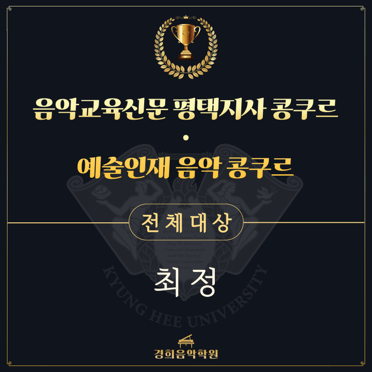 우리 경희아가 지난 2월 14일에 음악교육신문 콩쿠르와 예술인재 음악콩쿠르에서 전체대상을 무려 2관왕이나 했어요❤︎ 한 분야에서 뛰어나기란,, 힘든 일이라는 것을.. 이렇게 대견하고 기특한 결과가 있기까지 아이가 흘린 땀과 노력이 주마등처럼 스쳐가는 순간입니다 <img src="https://blogthumb.pstatic.net/MjAyNjAyMjVfMTM2/MDAxNzcyMDE5OTYxMjU4.sVNMcpVu7UH4dlpEQcyYiPr_c1zFqBa41LKJkFNhQZQg.ZmjFctAYXahd8HPM3Y8tbLsL7ej7iK0KTmuiEVsEcZIg.PNG/%C1%A6%B8%F1%C0%BB_%C0%D4%B7%C2%C7%D8%C1%D6%BC%BC%BF%E4._%281%29.png?type=s3" />