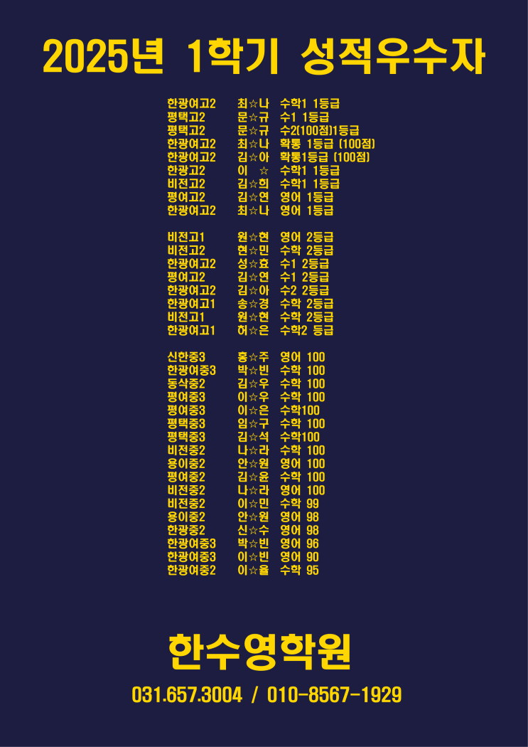 [공지] 평택 한수영학원 용죽 수학학원 영어학원 2025년 1학기 성적우수자