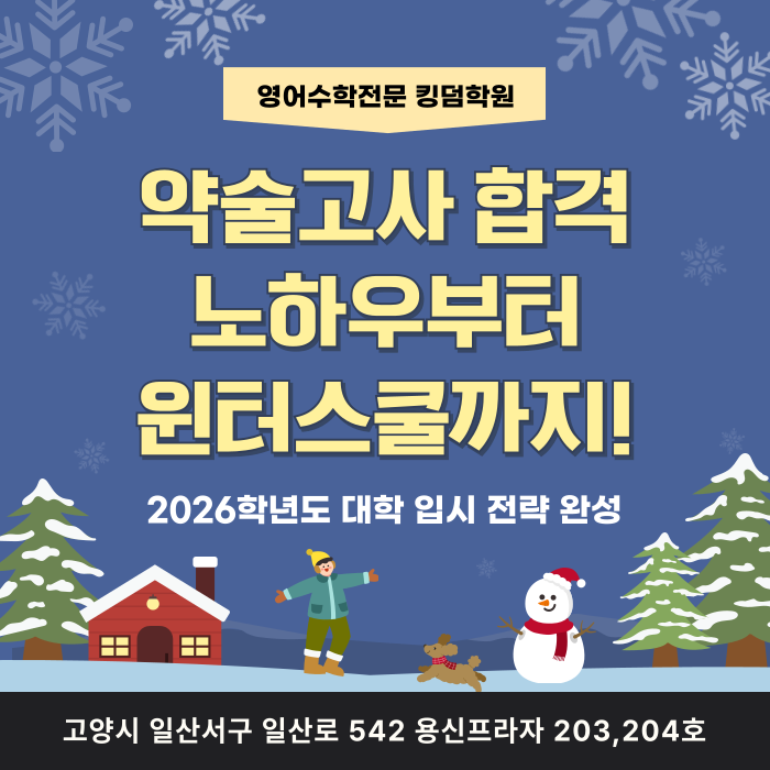 안녕하세요! Nothing is Impossible to We ( Engilsh & Math) 믿고 보낼 수 있는 학원! 내신대비와 수능 성적의 향상을 기대할 수 있는 학원! 고양시 일산동 후곡학원가에 위치한 고등부 입시/ 내신 영어, 수학 전문 킹덤 학원입니다. 2026학년도를 맞이하는 고등부 학생들에게 겨울방학은 1년의 성패를 좌우하는 중요한 시기입니다. 킹덤학원은 단순한 내신 관리뿐 아니라, 약술고사 합격 노하우와 개별 맞춤 윈터 프로그램을 통해 학생들이 원하는 목표를 달성하도록 돕고 있어요. 킹덤학원의 핵심 전략과 윈터 계획을 자세히 안내해 드립니다. 약술고사 합격 신화! 내신/정시 불리한 학생들에게 열린 기회 킹덤학원은 학원 개원 이후 약술....... <img src="https://blogthumb.pstatic.net/MjAyNTEyMTBfMjIz/MDAxNzY1MzYzNTkwMzI3.1V2nvg2874jbQPlp-qI-FPpbifL9DtBLFNHqIjRqfN0g.VmsZ6pV_lOXuzyXkv-GteVgvlhNfusG1vuNOJYuB6Pwg.PNG/001.png?type=s3" />