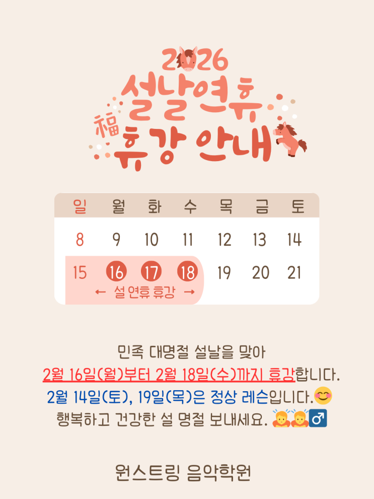 안녕하세요? 원스트링 음악학원입니다. 민족의 대명절 설이 다가오고 있습니다. 설 연휴 기간인 2/16(월) ~ 18일(수)에는 휴강합니다. 2/14(토), /19(목), 20(금)은 정상 레슨이오니 꼭 확인하시어 착오 없으시길 바랍니다. 복 되고 즐거운 설 명절 보내세요.♂️ 문의 010-7236-5103 팔로우하고 학생 연주 및 행사 소식을 받아보세요! <img src="https://blogthumb.pstatic.net/MjAyNjAxMzBfMTAw/MDAxNzY5NzQ1MTU3NzAz.dMm1Lo25my7zQheLQTou36-n_9HqDwyk5n7-f_J3FSAg.L99lU9PPYvcWXKwVpQV90gzY50aiSXQuJCbKynqFhxEg.PNG/2026-2_%BC%B3%B3%AF_%BF%AC%C8%DE.png?type=s3" />