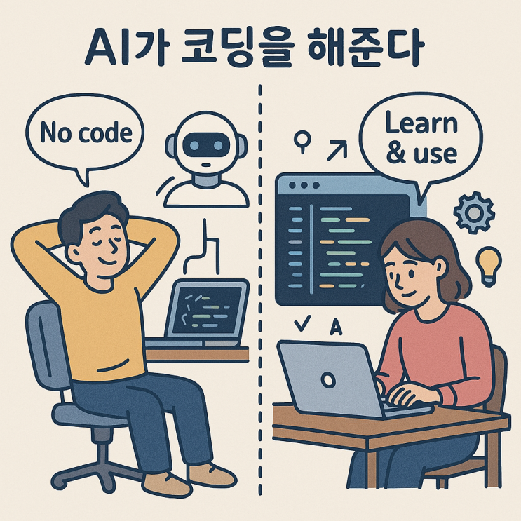 오늘날 인공지능이 급속히 발전하면서 “AI가 코딩을 해준다”라는 말이 자주 들립니다. 이 말 속에는 두 가지 상반된 태도가 존재합니다. 첫째, AI가 코딩을 대신해 주니 이제는 사람이 직접 코딩을 배우지 않아도 된다고 생각하는 부류가 있습니다. 둘째, AI가 코딩을 도와주니 오히려 내가 코딩을 잘 이해하고 활용해야 한다고 여기는 부류가 있습니다. 겉으로 보기에 첫 번째 태도는 편리해 보일 수 있습니다. 하지만 이는 단순히 도구에 의존하는 것에 불과하며, 스스로 문제를 해결하는 능력을 기를 기회를 놓치게 됩니다. 반면 두 번째 태도는 AI를 도구로 삼아 자신의 사고력과 창의력을 확장하려는 자세입니다. 코딩을 이해하고 활용할....... <img src="https://blogthumb.pstatic.net/MjAyNjAyMDRfMjkz/MDAxNzcwMTk5ODIxNTM3._xa2F52hSbjXqh9djA5bnRH-5WPfZXxAZSIaeAiOL34g.tyk2KSC-00SMcUgmPPsJMp9Mg036p_nhYnGzNrUeRgQg.PNG/%C3%A5%BB%F3_%C0%A7%BF%A1%BC%AD_%BE%C6%C0%CC%B0%A1_%C4%DA%B5%F9%C0%BB_%B9%E8%BF%EC%B8%E7_%B9%AE.png?type=s3" />