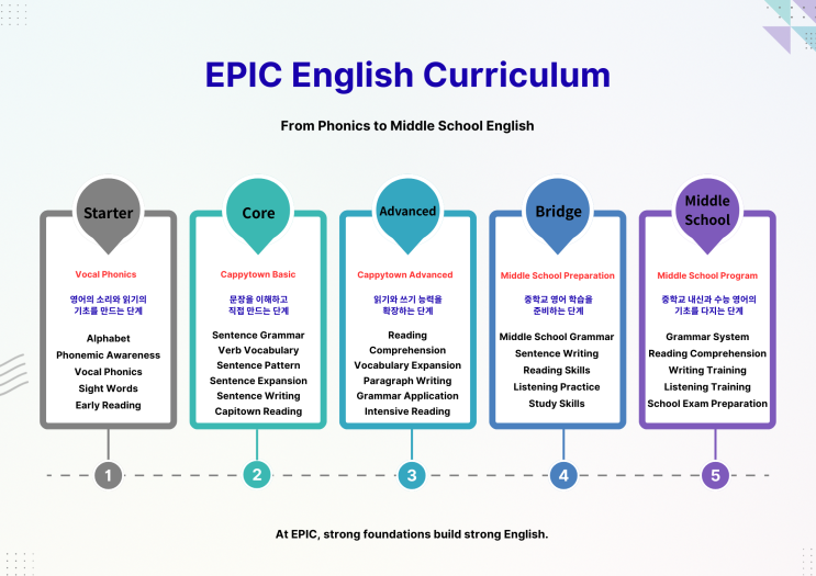 미사영어학원을 찾는 학부모님들과 상담을 하다 보면 가장 많이 듣는 질문이 있습니다. 에픽 영어에서는 아이들이 어떤 과정을 통해 영어 실력을 키우나요? 영어는 단기간에 실력이 완성되는 과목이 아닙니다. 특히 초등 시기의 영어는 기초를 어떻게 만들었는지가 이후 중학교 영어를 좌우합니다. 그래서 미사영어학원 EPIC English에서는 단순한 문제풀이 중심의 영어 학습이 아니라 Phonics → Reading → Writing → Middle School English로 이어지는 단계별 성장 커리큘럼을 운영하고 있습니다. 아이들이 영어를 • 읽고 • 이해하고 • 표현할 수 있는 힘 을 기르도록 돕는 것이 에픽 영어의 목표입니다. EPIC English Curriculum From Ph....... <img src="https://blogthumb.pstatic.net/MjAyNjAzMTZfMjA0/MDAxNzczNjQ4NjIxMTcz.Eyx9afhaY9vyy7spGy58ZQNLuP0aDdYMdiF-Z9d8HDgg.gz7kBiJ2-Nx2VWA2XoJBuxO5u1mMEheDjIl8Mlk-Fckg.PNG/Blue_and_Purple_Tech_Growth_Timeline_Presentation%C0%C7_%BB%E7%BA%BB_%282%29.png?type=s3" />