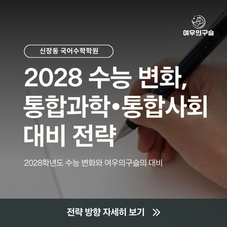 과정과 결과로 보답하는 신장동 국어학원, 여우의구슬 안녕하세요. 여우의 구슬입니다. 요즘 학부모님들께서 가장 많이 궁금해하시는 것 중 하나가 바로 2028학년도 수능 변화입니다. 특히 현재 중학생과 예비 고등학생을 둔 학부모님이라면 더욱 관심이 클 수밖에 없습니다. 이번 수능 개편에서 가장 큰 특징은 문과와 이과의 경계가 사실상 사라진다는 점입니다. 기존처럼 선택 과목을 통해 전략적으로 시험을 준비하는 방식이 아니라, 모든 학생이 동일한 과목으로 평가를 받게 됩니다. 그 중심에 있는 과목이 바로 통합과학과 통합사회입니다. 1️⃣ 시험 구조의 변화: 모두가 같은 시험을 보는 시대 기존 수능에서는 학생이 선택한 과....... <img src="https://blogthumb.pstatic.net/MjAyNjAzMTdfMTcx/MDAxNzczNzI0NjExMTA1.Otq9h2jWqWLn6-tW4b-XYnwHwBkNT3WVXcFILRcZG7cg.FBHXQjUocghktYjdZ8yeaZMbXHCyf2D7VyzNhkvVDIcg.PNG/1.png?type=s3" />
