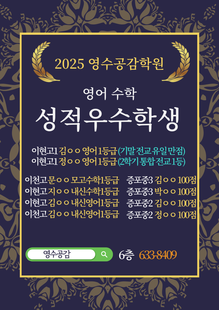 성적 우수와 향상의 기쁨, 영수공감이 장학금으로 응원합니다! 안녕하세요, 영수공감학원입니다. 영수공감은 이번 2025년 2학기부터 학생들의 노력을 격려하고자 '성적 장학금' 제도를 신설하였습니다. 결과도 중요하지만, 그 결과를 만들기 위해 밤낮으로 흘린 땀방울의 가치를 누구보다 잘 알기에 준비한 특별한 선물입니다. 최상위권의 유지부터 기적 같은 등급 상승까지, 여러분의 성장을 영수공감이 끝까지 응원하며 장학금으로 그 가치를 더하겠습니다. [성적 장학금 수여 기준] 대상: 영어, 수학 수강 과목에 한함 고등부: 내신 및 모의고사 1등급 달성 시 (성적표 확인 후 수여) 직전 등급 대비 1개 등급 상승 시 (성적표 확인....... <img src="https://blogthumb.pstatic.net/MjAyNjAxMTNfMjQ2/MDAxNzY4MjkzODE2MjMx.9R0C1_jL-RXEHy-vfLJgvWJ98_cYeAbnq9pWPbyUUtYg.CtY_Rf-59Wn9v2L8OowwKbZ9vsR6N817pJbtShEioIQg.PNG/%BA%B8%B6%F3%BB%F6_%B1%DD%BB%F6_%B8%B8%B4%D9%B6%F3_%C6%D0%C5%CF_%C0%CF%B7%AF%BD%BA%C6%AE%B7%B9%C0%CC%BC%C7_%C0%CE%C1%F5%BC%AD.png?type=s3" />