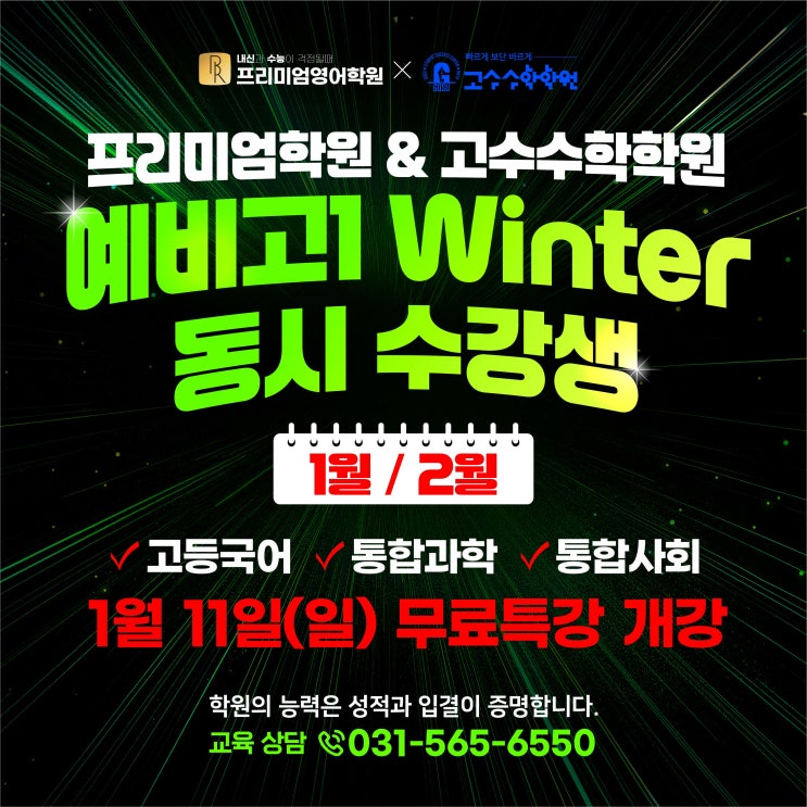 [프리미엄학원&고수수학학원 고등관]2026학년도 예비고1을 위한 고등국어/통합과학/통합사회(한국사) 무료특강 1월11일(일)개강 안내