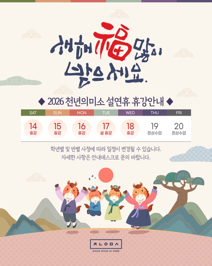 2026년 병오년~ 강릉천년의미소 학생들이여 새해 복 많이 받고 올 한해도 적토마 처럼 멋지게 달려봅시다~^^ 미대에 대한 바른 고민 강릉 천년의 미소 미술학원 <img src="https://blogthumb.pstatic.net/MjAyNjAyMTFfNjgg/MDAxNzcwODA5MDIwMDY2.GKTfP5bQY2fcdxn1x0iAr5IFSh7WaTK6OceqyEyKvQgg.b1BrynbXLwNCRXCsY-dcb50tROMDbvvHGz4jYFIOYBAg.JPEG/2026_%BC%B3%BF%AC%C8%DE_%C8%DE%B0%AD%BE%C8%B3%BB02.jpg?type=s3" />