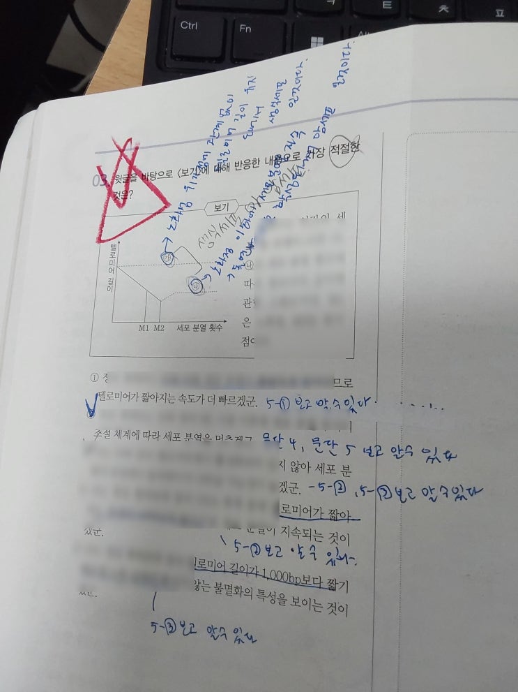 이 학생은 학원 들어와서 지금까지 조금씩 조금씩 성장해 왔는데 올 겨울방학 들어 정체기가 왔어요. 모의고사 성적이 처음엔 5~6등급 대였다가 2등급 언저리인 백분위 88~87%로 추정되는 점수로 정점 찍은 뒤 80% 초반 대로 떨어진 상태죠. 성적의 변화는 숙제의 성실도와 궤를 함께 하나봐요. 그래서 2월 5일 업로드 글 '예비고1 숙제로 대화하기'에서 썼듯 걱정된다는 취지의 해설을 달아서 숙제를 돌려주었는데 다시 예전의 모습으로 돌아왔네요^^ 글을 읽고 스스로 내용 요약 정리를 해온 것도 무척 오랜만이라 무척 반가웠어요. 시간 조금 내서 말을 건넸더니 바로 화답해 오니, 더 신경 써서 설명해 주고 싶은 의지가 생기네요....... <img src="https://blogthumb.pstatic.net/MjAyNjAyMTlfMTU1/MDAxNzcxNDkyOTY4MzY3.BnlMEgBWZSpCaImMpkvyO-vXK0Vje6dWQRPDPHB6VJYg.Y7glQTlb6YIm40C1xeU9ChyK7crTsMqHsDCMiNEHAC8g.JPEG/KakaoTalk_20260219_180350785.jpg?type=s3" />
