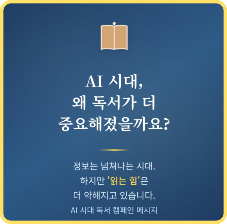100년이 지나도 독서는 계속될 것입니다 AI가 글을 쓰고, 요약을 해주고, 문제를 풀어주는 시대입니다. “100년 뒤에도 독서는 계속될 것입니다.” 왜일까요? AI 시대, 독서의 의미 최근 EBS ‘AI 시대 독서’ 캠페인 영상에서 한 교육 전문가는 이렇게 말했습니다. > “AI는 답을 줄 수 있지만, 질문을 만드는 힘은 인간의 영역입니다.” 정보를 찾는 능력은 점점 쉬워집니다. 하지만 ✔ 정보를 연결하는 힘 ✔ 맥락을 이해하는 힘 ✔ 비판적으로 사고하는 힘 은 여전히 ‘읽는 과정’에서 자랍니다. 왜 독서는 사라지지 않을까요? 기술은 변합니다. 교과 과정도 바뀝니다. 입시도 달라집니다. 하지만 변하지 않는 것이 있습니다. ....... <img src="https://blogthumb.pstatic.net/MjAyNjAzMDJfMTQg/MDAxNzcyNDMxODg5NDE4.ZmjINO5t25pUTvj48n4gnlZFYrHODCUgvyGj7Hz5XJUg.ddao7h5s7W7qfB3DfjmhpUDFBc7GLDIuJn1hqfWvo8Ag.PNG/900%A3%DF%C1%A6%B8%F1_%C3%DF%B0%A1%A3%DF20260302%A3%DF150149%A3%DF0000.png?type=s3" />