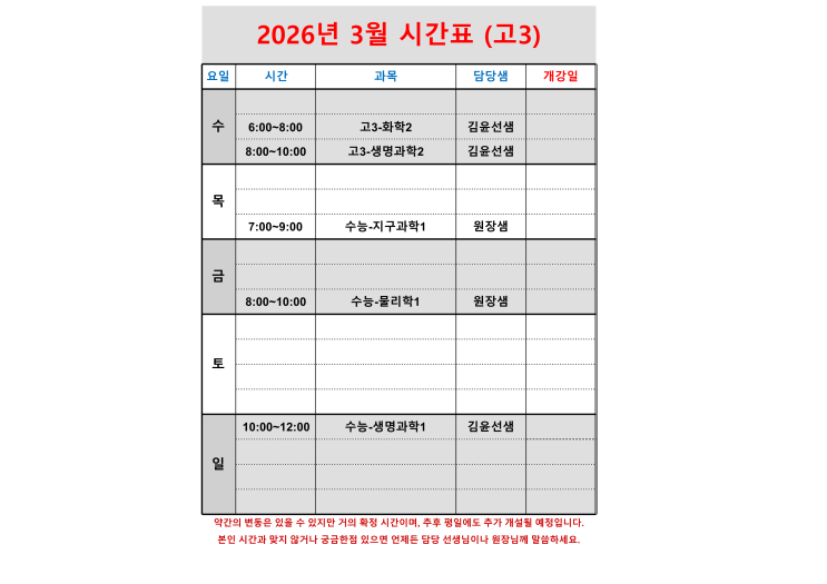 【수능반 교재】 21~27학년도 수능특강, 수능완성 자이스토리, 마더텅 모의고사 【내신반 교재】 화학2, 생명과학2(수능특강) 물리학2 특강(완자 물리학2) <img src="https://blogthumb.pstatic.net/MjAyNjAyMjVfMTc0/MDAxNzcyMDI3Mzg1Njk2.3egjeFCInYW4KdtO-VkHuAqsBBGZoEhMMKRn_yl1yTkg.Q7YF_cdbFVSqjg_gPz78lsJldEk1RMphZW7DOvm6qQcg.PNG/26%B3%E2_3%BF%F9_%BD%C3%B0%A3%C7%A5_4.png?type=s3" />