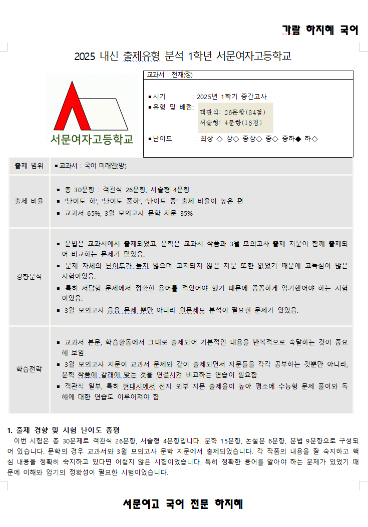 안녕하세요? 가람 하지혜 국어 전문 학원의 하지혜 원장입니다. 오늘은 서문여고 1학년 2025년 1학기 중간고사 시험지 기출분석으로 포스팅해보도록 하겠습니다. 1학기 중간고사는 100점이 많이 나왔던 시험인데요. 가람 국어 학원의 학생들도 거뜬히 100점을 받았습니다^^ 서문여고는 100점이 많이 나오는 시험과 매우 어렵게 출제하는 시험으로 나누어지는데요. 고르게 난이도를 유지하는 것이 아니라, 조금 널을 뛰기도 한다는 점이 특이점입니다. 이러한 특성이 학생들에게 끼치는 영향은! 쉬운 시험을 겪고나면 매우 해이해진다는 것이지요. 바로 다음 시험은 매우 어렵게 출제하여 조절을 하는 경향이 있습니다. 그래서 기본적인 내용을 잘....... <img src="https://blogthumb.pstatic.net/MjAyNjAzMDFfMjg5/MDAxNzcyMzY5MzkwNjkz.hdn2CLsvlX22Qb9S7LnShT0l-vSn8CgwCAwFl927wBIg.Z6pufObXdifNgWCZkAJDpDO7gsaL1Euo8zp6UGVaogQg.PNG/image.png?type=s3" />