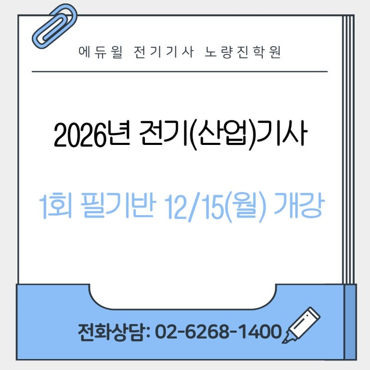 안녕하세요, 에듀윌 노량진 전기학원입니다. 2026년 전기(산업)기사 1회 필기 대비반이 12/15(월) 새롭게 개강합니다! 26년 1회 필기반 개강 1) 12/15(월) 기초이론 (1주) - 월-금 19:00~22:00 2) 12/22(월) 필기이론 (7주) - 월-금 10:00~14:00 3) 01/12(월) 필기문제풀이 (5주) - 월-금 19:00~22:00 상세시간표 시험일정 교재 - 에듀윌 2026 전기(산업)기사 필기 기본서 (과목별) <img src="https://blogthumb.pstatic.net/MjAyNTEyMTFfMjk4/MDAxNzY1NDIyNzY3MzE4.9Sjy8CnOPEzuuKwQqkHFHlxWAbKdNkJWIIoKNwLLAtog.dQR-XcjqH1caeOcHq1zi2qR-Ktv3xK6X65niBWVBvxEg.JPEG/1.jpg?type=s3" />