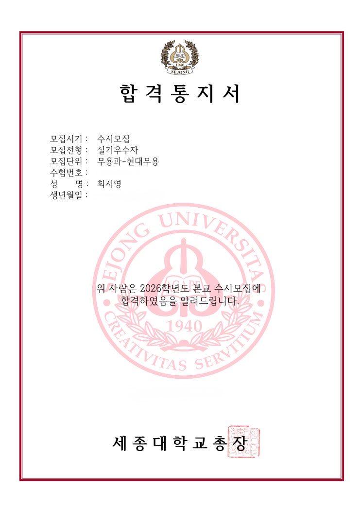 진병철무용학원의 교육과정을 통해 세종대학교 수시모집에 합격하였습니다. 진병철무용학원은 진병철 원장님을 중심으로, 입시 경험과 실력을 갖춘 최고의 강사진이 함께하는 전문 입시 프로그램을 운영하고 있습니다. 짧은 기간의 입시 준비일수록 확실하고 체계적인 프로그램 안에서 계획적으로 진행되어야 합니다. 학생들의 빠른 성장은 검증된 교육 방식과 지도자의 풍부한 경력에서 시작됩니다. 010-4920-7447 (상담은 미리 예약 후 진행됩니다.) #서울 #무용 #무용학원 #현대무용 #발레 #현대무용학원 #예술고등학교 #체조 #리듬체조 #체조학원 #초등학생 #영재 #중학생 #고등학생 #키즈 #입시전문 #동작구 #shorts #릴스 #보라매역 #대방....... <img src="https://blogthumb.pstatic.net/MjAyNTEyMjBfNjgg/MDAxNzY2MjExMTA3MTM5.oP2beFE5g8yT8SjklG2zWFdyd2uf0BlgbWf7DjE6Yg0g.YuLVlnFPEVhI_WZfp6nAvBz1EopVoZKnOvWR2ETMbhAg.JPEG/%C3%D6%BC%AD%BF%B5_%BC%BC%C1%BE%B4%EB%C7%D5%B0%DD.jpg?type=s3" />
