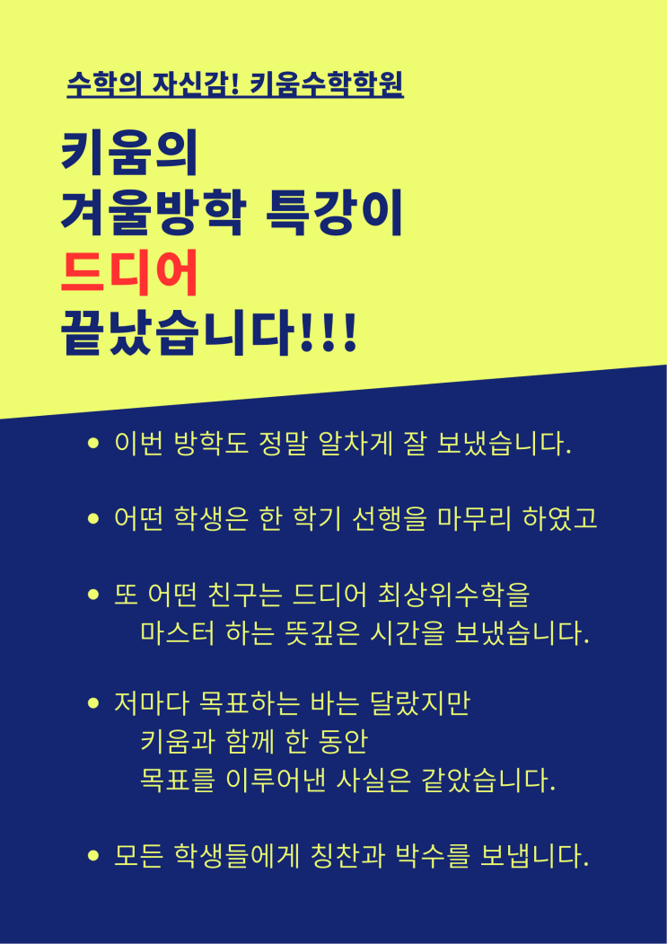 키움의 겨울방학 특강이 드디어 끝이 납니다. 이번 방학도 키움의 학생들은 정말 알차게 자~알 보냈답니다. 어떤 학생은 한 학기 이상의 선행을 마무리 하기도 하였고 또 어떤 학생은 평소에는 용기를 내기 힘들었던 최상위수학을 마스터하기도 했습니다. 저마다의 목표는 조금씩 다른 시간이었지만 결국은 이루어 내었다는 사실은 같았습니다. 짧지 않은 시간 열심히 공부 해 온 우리 학생들에게 또 방학 동안 치열히 공부해 온 모든 학생들에게 칭찬과 박수를 보냅니다. 모두들 수고했습니다! 그만큼의 결과가 꼭 따라 올거라 키움이 확신합니다. ^^ #정평동수학학원 #정평초수학 #정평동수학 #정평초수학학원 #정평초 #초등수학전문 #중등수학....... <img src="https://blogthumb.pstatic.net/MjAyNjAyMjVfMTEw/MDAxNzcxOTg1NTI5MTUw.5WwNy42yUMna5RW3MQzTnRK5R_8aL6MeRsPIIUSaBqIg.Gq0K1bhojoYxa1fT7E8ueCCqx5BUHSzqdgv922BDOY8g.PNG/bold_bright.png?type=s3" />