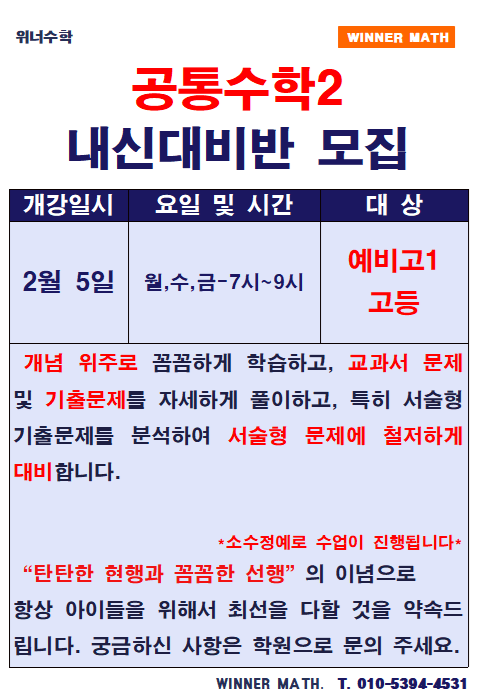 1월 30일 부터 예비 중앙여고 1학년 신규반을 모집합니다. < 중앙여고 예비고1 월수금반 > 월수금 7시 ~ 8시 50분 교습비 35만원 (주 5시간 30분) 내신 및 독해 문법 수업 독해 : 능률 빠른독해 바른독해 구문독해편 문법 : 고교영문법 3300제 단어 : 개별 진도에 따른 과제 (워드마스터 수능2000, 워드마스터 고등 complete) <img src="https://blogthumb.pstatic.net/MjAyNjAxMjRfMjA0/MDAxNzY5MjUyNzk2ODk5.J6qg8vJTOWvgFkMjV1UH6ou0jMwmalUo1f8ZqPkOaOwg.u7k93SscW6YNrz-uzOMgK5NcgJInZIrumsKa1ofBK9wg.JPEG/profileImage.jpg?type=s3" />