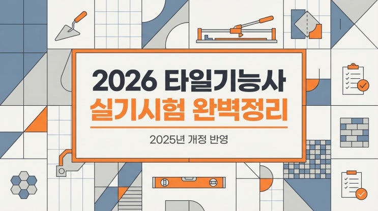 2026년 타일기능사 실기시험 완벽 정리 (2025년 개정 반영) 안녕하세요, 현대건축타일학원입니다! 2025년부터 타일기능사 시험이 대폭 개정되었습니다. 난이도 상향, 시험시간 단축, 작업방식 변경까지! 2026년 시험을 준비하시는 분들은 반드시 확인하세요. 2025년 개정, 무엇이 바뀌었나? 타일기능사 시험이 2025년부터 실무 중심으로 완전히 개편되었습니다. 가장 큰 변화는 시험시간 10분 단축, PVC 코너비드 삭제, 문양 변경 세 가지입니다. 주요 변경사항 3가지 1. 시험시간 10분 단축 변경 전: 4시간 40분 → 변경 후: 4시간 30분 더욱 빠르고 정확한 작업 능력이 요구됩니다 2. 지급재료 변경 바닥타일 1장 증가 (27장 →....... <img src="https://blogthumb.pstatic.net/MjAyNjAyMjRfMzEg/MDAxNzcxOTIxNDYwMTEx.7_hLwo2MJfPG37tHSuGFYgau5Og3vDJmdRdscwDUOcog.xMSHGRLQSu0eP_lg6hMse13gteqV81dgQniFDHOYeTIg.JPEG/%B1%E2%B4%C9%BB%E701.jpg?type=s3" />
