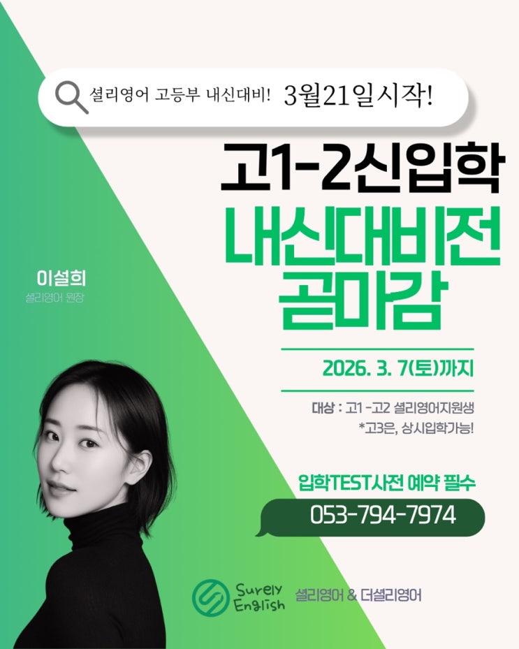 셜리영어의 탁월한 고등부 내신대비는 3월21일 시작! 셜리영어의 탁월한 재원생 준비 및 관리를 위해 고등부 신입학이 3월7일 마감됩니다. 고등부 신입학재개는 5월중순 다시 진행됩니다. 서두르세요, 중간고사대비전! 탁월한 선택을 하세요 <img src="https://blogthumb.pstatic.net/MjAyNjAyMjNfMjYz/MDAxNzcxODUwOTc2MDk1.QGgPCKkFHOcZzy0N_38ag9VJCKe8Dn4GHb8celSLpm0g.Jan3XuQcgt4BJa1ON-VAdyQ-5x6U94ruyQX9gVRkPxMg.JPEG/IMG%A3%DF2598.jpg?type=s3" />
