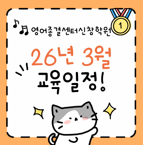 안녕하세요 영여종결센터 신창학원 캔두쌤입니다~ 겨울방학동안 열심히 기본을 닦으며 열공하니 벌써 3월 개학이 다가 왔습니다. 설레임이 가득한 새학기 우리 영종친구들에게는 든든하고 힘이 넘치기만을 바래봅니다~ 3월 교육일정안내드릴께요~ 3월휴무일 3월2일 월요일 대체공휴일은 쉬어갑니다. 3월1일 삼일절을 맞이하여 2일 월요일이 대체공휴일로 지정이 되었습니다. 가정에서 이날의 의미를 함께 나누시며 새학기 더욱 힘이나는 시간이 되어가길 바래봅니다. 초등교육일정 영어종결센터 신창학원 3월 초등부 일정은 3월31일 화요일 월말고사가 진행되어질 예정입니다. 4월1일 오답도 꼭 챙겨가보며 잘하는부분 못하는 부분 피드백도 확실....... <img src="https://blogthumb.pstatic.net/MjAyNjAyMjZfMTg1/MDAxNzcyMDc1Njg5MDM3.RJSHVkJUw7osu3MI-izExtJl1WZb_OPh6arxneP9BG8g.AINoXYCQcnUbRFwJjHBLLXgc2KDXBJoOyrp2XeAAdZMg.PNG/image.png?type=s3" />