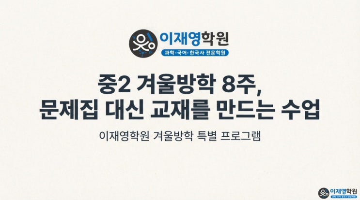 중2 과학 최상의 학습법 백지테스트를 넘어선 교재를 만드는 수업 안녕하세요 평택에서 과학 국어 한국사 제일 맛있고 진지하게 학습하는 이재영과학국어한국사 전문학원입니다. 겨울방학을 맞이하여 막연한 선행학습에 피로감을 느끼고 본질적 내적강화 학습에 목말라 하시는 깨어있는 교육관을 지니신 분들을 위한 백지테스트 스핀오프!! 이재영학원의 교재만들기 프로젝트를 안내하려 합니다. 중2 방학, 문제집보다 중요한 학습이 있습니다 중2 방학은 과학 학습에서 방향을 다시 잡을 수 있는 결정적 시기입니다. 이 시기를 문제집 반복으로 보내면 단기 성과는 있을 수 있지만, 고등학교 과정까지 이어지는 개념 안정성은 확보하기 어렵습니....... <img src="https://blogthumb.pstatic.net/MjAyNjAxMTZfMTcw/MDAxNzY4NTQ3Nzg5Njk0.pJESB0lilVOvHFisGsRQqZejEriakrSsp-eLDzo_4yog.7zyO0DevnCcEoRXIt36GHQwZwPm4ZDJtAO61JPUltJ8g.JPEG/IMG%A3%DF0057.JPG?type=s3" />