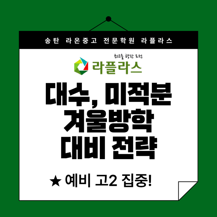 안녕하세요. 평택 송탄 라온중고 전문학원 라플라스입니다. 송탄 수학 학원 라플라스에서는 겨울방학동안 그동안 열심히 수업을 해서 대수가 끝나고 26년 1월 28일부터 미적분1 수업이 시작됩니다.또한 겨울방학을 맞아 2월 3일부터는 대수 수업이 화 목 주2회 정규 수업으로 진행되고 토요일에는 테스트 및 첨삭 수업이 추가로 이루어 질 예정입니다. 본 수업 대상은 예비고2 학생들이며 라온고 학생들과 송탄지역의 타학교 학생들도 모두 다 참여 가능합니다. ... 솔직히 말해봅시다. 고1 수학, 다 이해되었다고 해서 고2 대수가 할만할까요? 문제 풀 때는 맞는데 설명하라면 막히고 공식은 외웠는데 왜 쓰는지는 모르겠고 미적분 얘기만 나오....... <img src="https://blogthumb.pstatic.net/MjAyNjAxMjFfMTQ0/MDAxNzY5MDAwNTk0MzI3.g5BqCCRz3-z2I3Z4R4-B_2rGXOfrWZCXtLdfZg0kg28g.I0kB6wIL2TB6xo0QUbKcxS_HUchURVggqgxFtXdvmwsg.PNG/1.png?type=s3" />